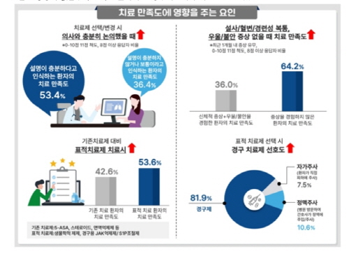 ÁßÁõÀÇ È¯ÀÚµéÀÌ Ã³¹æ¹Þ´Â »ý¹°ÇÐÀû Á¦Á¦³ª °æ±¸¿ë JAK¾ïÁ¦Á¦/S1P ¼ö¿ëüµé°ú °°Àº ÃֽŠǥÀû Ä¡·áÁ¦µéÀ» ó¹æ¹Þ´Â ȯÀÚµéÀÇ Ä¡·á¸¸Á·µµ(53.6%)°¡ °æÁõ¿¡¼ ÁßµîÁõ¿¡ »ç¿ëÇÏ´Â 5-ASA, ½ºÅ×·ÎÀ̵å, ¸é¿ª¾ïÁ¦Á¦ µî ±âÁ¸ Ä¡·áÁ¦·Î Ä¡·á¹Þ´Â ȯÀÚÀÇ Ä¡·á¸¸Á·µµ(42.6%)¿¡ ´ëºñÇØ ´õ ³ô¾Ò´Ù. ¾à¹° Åõ¾à¹æ½Ä ¼±È£µµ¿¡ ´ëÇÑ Á¶»ç¿¡¼´Â, ÃֽŠǥÀû Ä¡·áÁ¦ Ä¡·á °æÇèÀÌ ¾ø´Â ȯÀÚµéÀÌ ÇØ´ç ¾àÁ¦·Î Ä¡·á¸¦ ½ÃÀÛÇÑ´Ù¸é º¹¿ëÆíÀǼºÀÌ ³ôÀº °æ±¸Á¦¸¦ ¼±È£Çϴ ȯÀÚ°¡ ´ë´Ù¼ö(81.9%)¿´°í, Á¤¸ÆÁÖ»ç(10.6%), ÇÇÇÏÁÖ»ç(7.5%)°¡ µÚ¸¦ À̾ú´Ù.