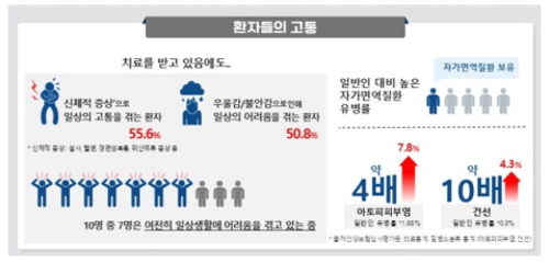 ¶ÇÇÑ ¿°Áõ¼ºÀåÁúȯ ȯÀÚµé Áß ´Ù¸¥ ¸é¿ªÁúȯÀ» µ¿¹Ý Áø´Ü¹ÞÀº ȯÀÚ ºñÀ²ÀÌ 10¸í Áß 2¸í(17.8%)¿¡ ´ÞÇß´Ù. ¼³¹®¿¡ ÀÀ´äÇÑ ¿°Áõ¼ºÀåÁúȯ ȯÀÚÀÇ °æ¿ì ¾ÆÅäÇÇÇǺο°Àº 7.8%°¡ Áø´Ü¹Þ¾Æ ÀÏ¹Ý À¯º´À² 1.88%1 ¾à 4¹è, °Ç¼±Àº 4.3%°¡ Áø´Ü¹Þ¾Æ ÀÏ¹Ý À¯º´À²(0.3%) ´ëºñ ¾à 10¹è À̻󿴴Ù. ÀÀ´äÀÚ Áß ´Ù¸¥ ¸é¿ªÁúȯÀ¸·Î Áø´Ü¹ÞÀº ºñÀ²Àº ·ù¸¶Æ¼½º°üÀý¿° 3.0%, °Á÷¼ºÃ´Ãß¿° 2.3%, °Ç¼±¼º°üÀý¿° 0.8%, ȳó¼ºÇѼ±¿° 0.5%, ·çÇÁ½º 0.3% ¿´´Ù.