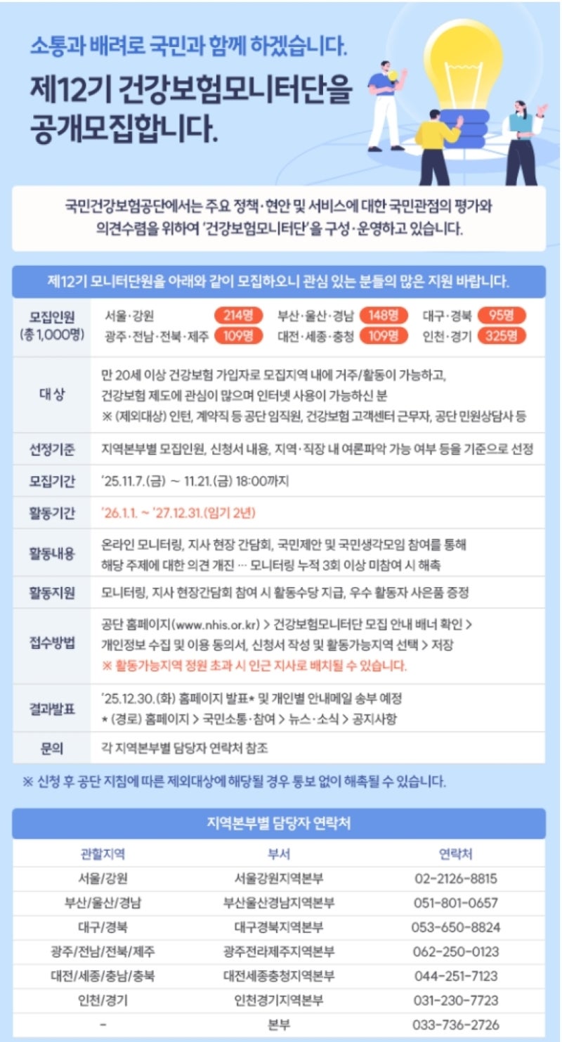 °Ç°º¸Çè¸ð´ÏÅÍ´ÜÀº °Ç°º¸ÇèÁ¦µµ ¹× Á¤Ã¥¿¡ °ü½É ÀÖ´Â ¸¸ 20¼¼ ÀÌ»óÀÇ ±¹¹ÎÀ̶ó¸é Áö¿ª¿¡ »ó°ü¾øÀÌ ´©±¸³ª ½ÅûÇÒ ¼ö ÀÖ´Ù. °ø´ÜÀº ÃÑ 1,000¸íÀ» ¼±¹ßÇÏ¿© ¿î¿µÇÒ °èȹÀ̸ç, Àǰ߼ö·ÅÀÇ °øÁ¤¼ºÀ» ³ôÀ̰íÀÚ Áö¿ªº°, ¿¬·Éº°·Î ºÐ»êÇÏ¿© ¸ðÁýÇÑ´Ù.